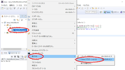 パッケージ・エクスプローラーから HelloWorld.java を右クリックし、「実行」-「Java アプリケーション」を選択します。